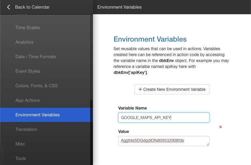 The dbkEnv object is a global configuration container used to store environment-level constants for DayBack app actions. It should be used for any data that should not be hardcoded into scripts.