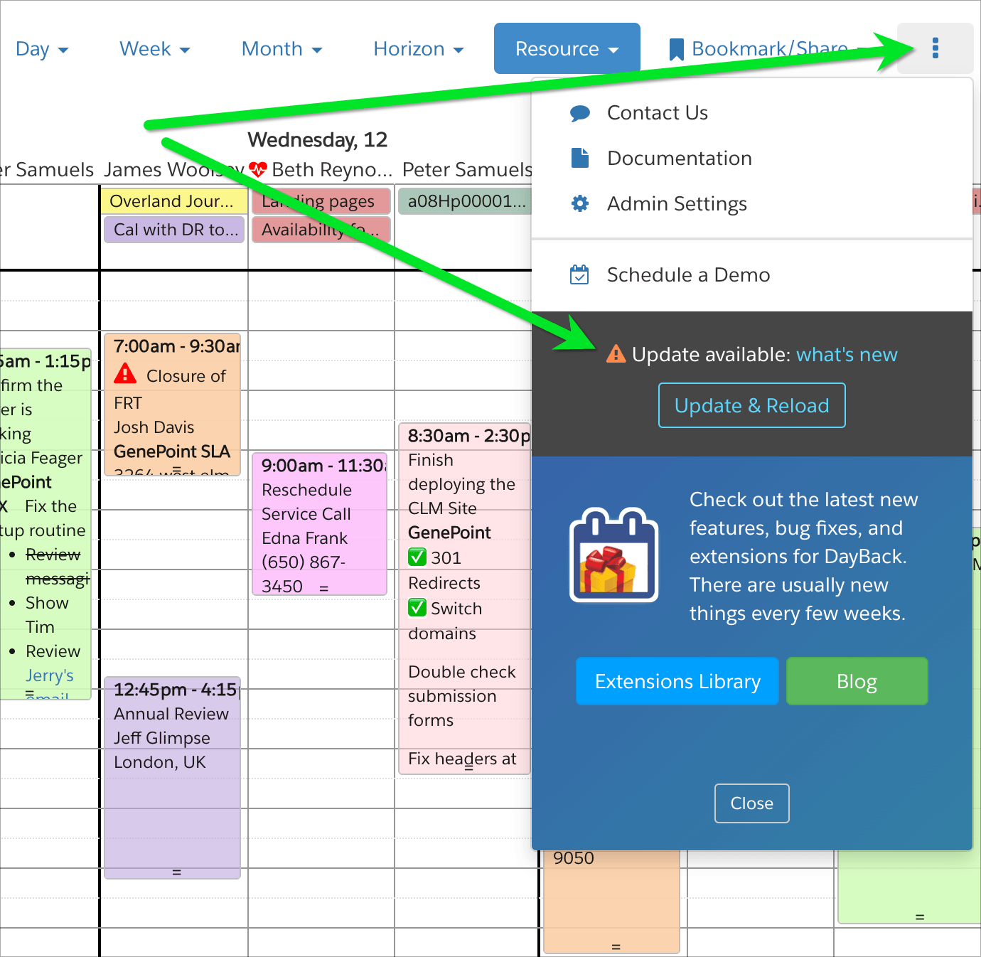 To make sure you have the latest version, refresh your browser and visit the updates status from the three-dots menu in DayBack: